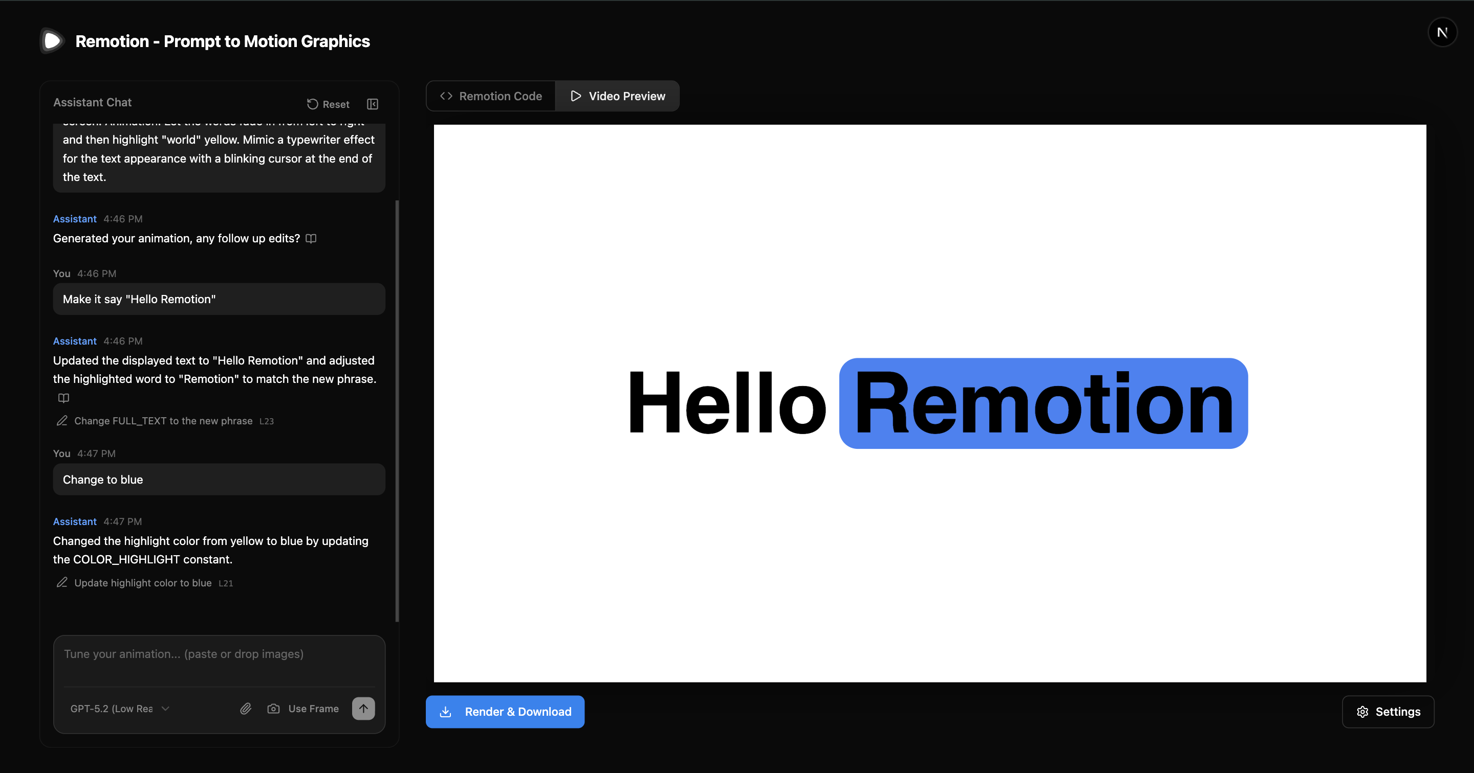 A SaaS template for "Prompt to Motion Graphics" products. Generates Remotion code, streams it to the frontend, and compiles and previews it in the browser. See the documentation page for more details.